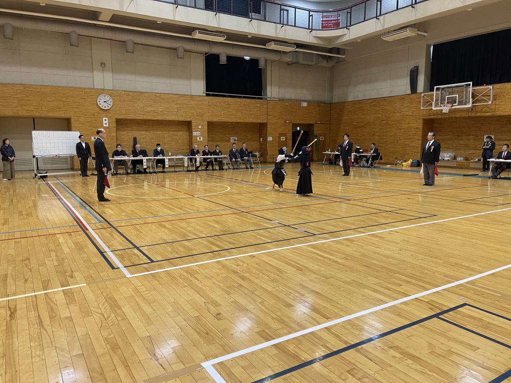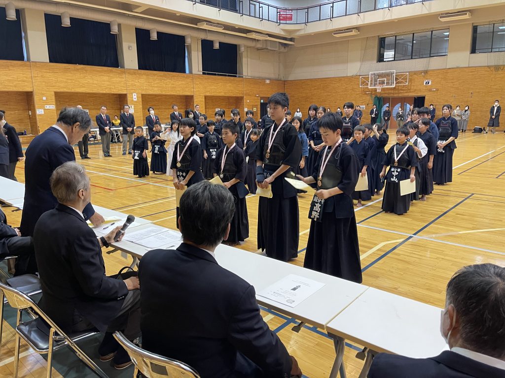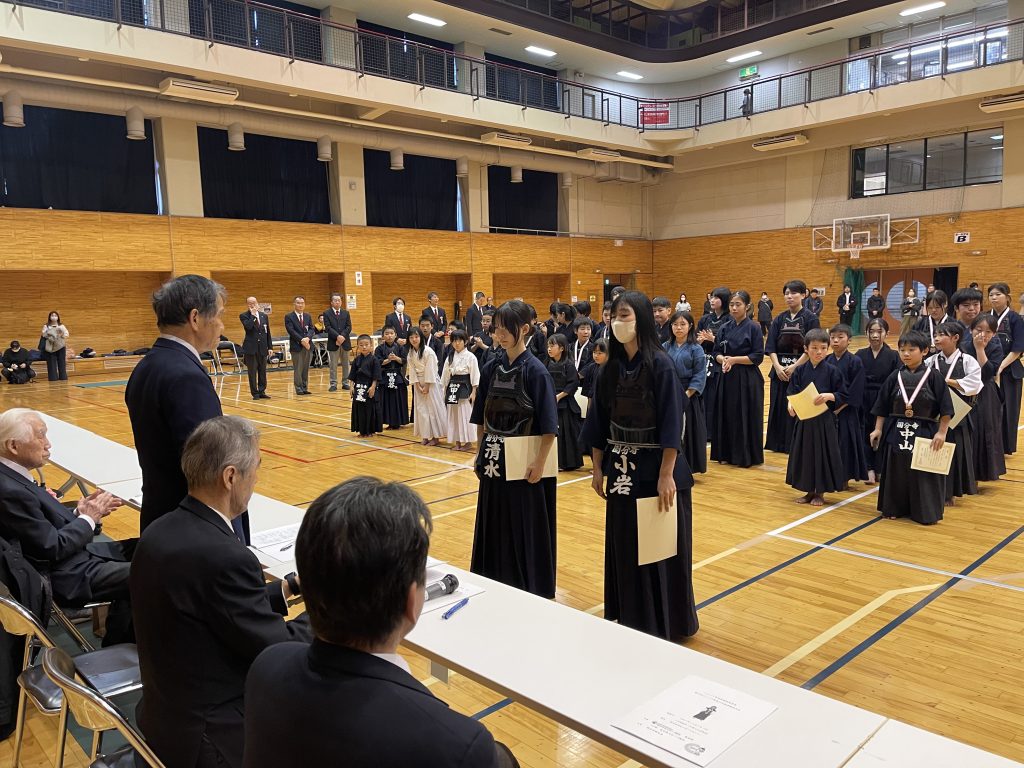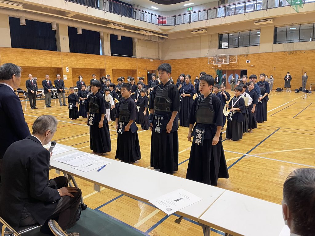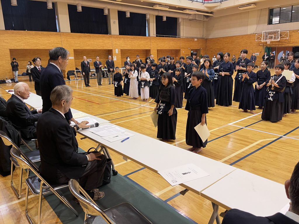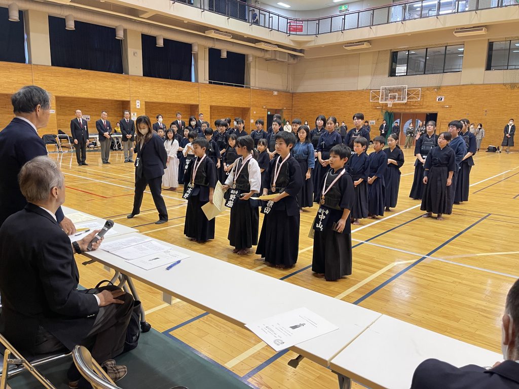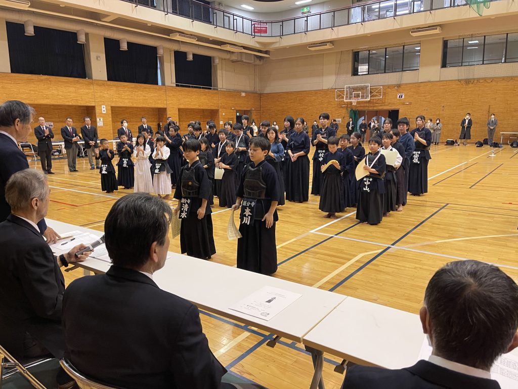 木刀による剣道基本稽古法披露、基本の部試技披露ののち、年齢別にリーグ戦・トーナメント戦を行いました。各試合において基本打ちの判定を行いそれを一本とする基本の鍛錬を特に重視する試合形式で行いました。